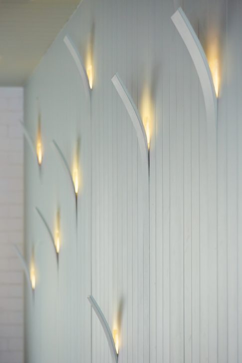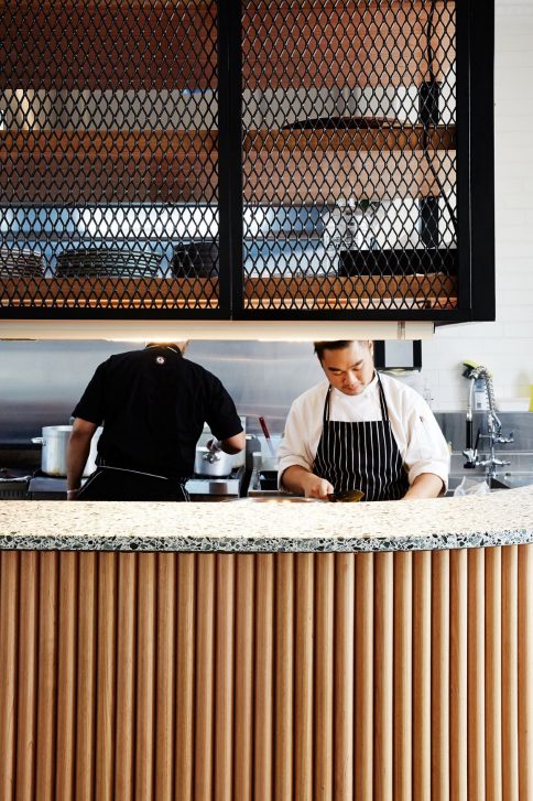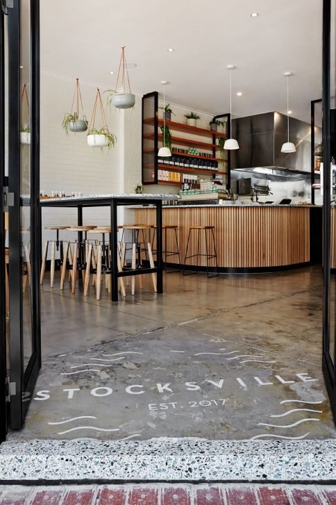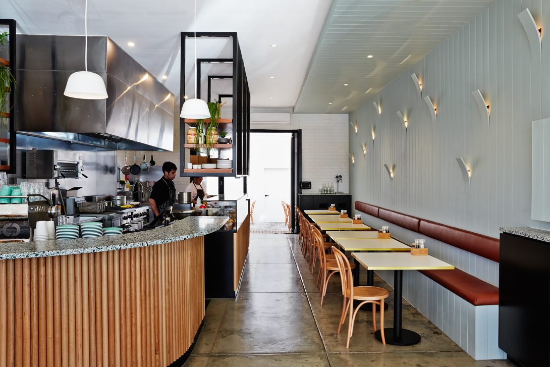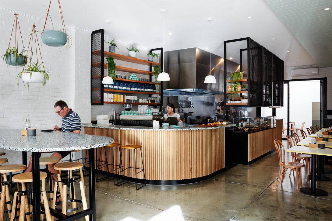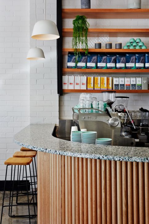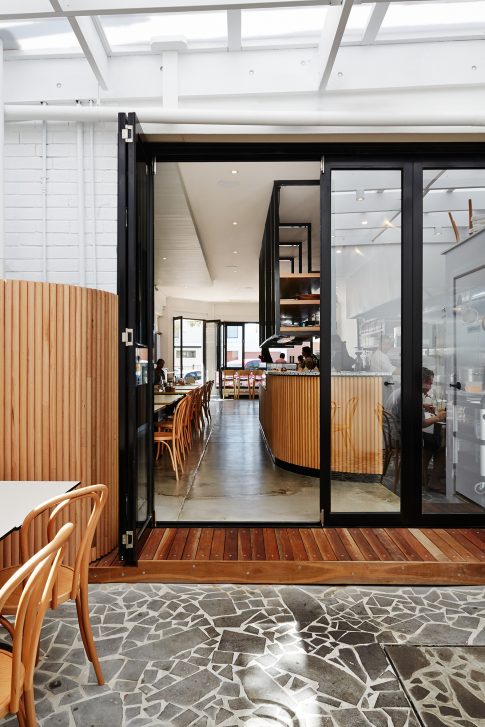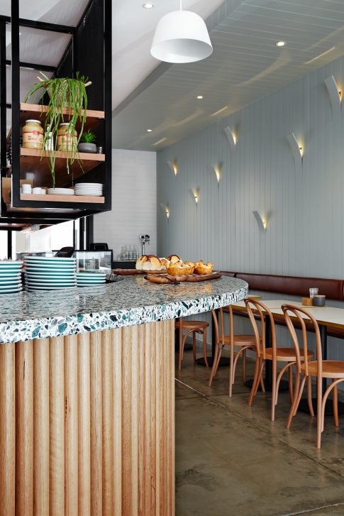 The design of the prominent corner tenancy, originally the local post office, pays homage to the history of the space through subtle cues including the shopfront signage and feature floor artwork, reminiscent of a postage stamp. Opening the space up was an integral part of the design outcome, with the aim to maximise natural light through the reinstated high-level shopfront windows and the creation of a connection through to the existing courtyard via large bi-fold doors. The Ashwood eucalypt forest is celebrated throught the use of natural tones and textures, featuring timber dowel counter front cladding, polished concrete floor exposing stone aggregate and a fresh white paint finish to the existing raw brickwork. Terrazzo slab features on the counter top in a fresh green tone, with open metal framework and mesh infill panels to shelving over, adding a raw, earthy aesthetic. A key feature of the space is the lining board cladding which extends the length of the tenancy, wrapping to the ceiling above. This element was designed to create the feeling of sitting beneath a tree canopy, with the occasional vertical board peeling away from the wall to reveal a warm ambient glow of light – representing the peeling bark of a eucalypt tree. Fresh, pale green adds an invigorating touch of colour to the space, complemented with the earthy tone of the adjacent tan leather banquette seat and solid timber furntiure. The courtyard space beyond has a sense of tranquillity and retreat, featuring rambling natural stone paving, breeze block walls and timber park-bench style seating with integrated planter boxes. A pergola structure extends above, creating a frame for plants to climb over and allowing soft, dappled light to filter through. The design outcome is a space that celebrates the location in Ashwood, it’s history and it’s community.
